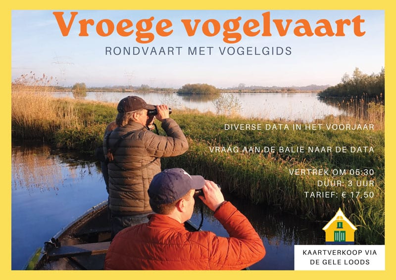 Ervaar de magie van het ontwaken van de natuur tijdens onze Vroege Vogelvaart. Terwijl de wereld nog stil is en de eerste zonnestralen over het water glijden, neemt een ervaren vogelgids je mee langs de mooiste plekken van het gebied. Dit is hét moment waarop vogels het meest actief zijn, ideaal om bijzondere soorten te spotten en meer te leren over hun gedrag.